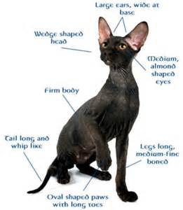 Members of the breed have an elegantly slim graceful and muscular build. They have a narrow and long head with a straight profile, almond-shaped eyes, wedge-shaped muzzle, and large, set-apart ears. They have a long whip-like tail, webbed feet and oval paws that allow them to grasp objects and open levered doorknobs.
